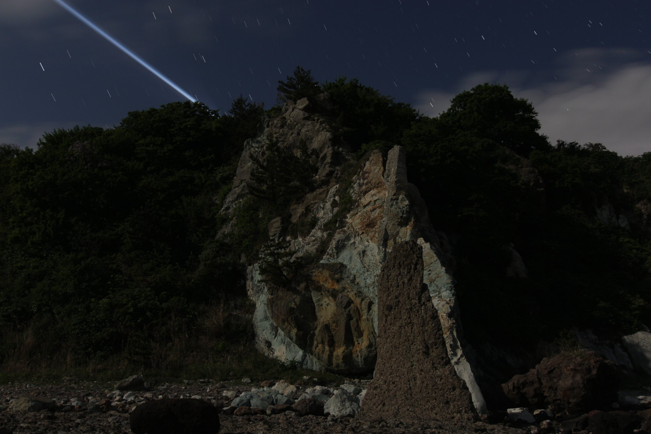 ≪星景写真≫ 三繰島照射光とグリーンタフ、ろうそく岩 (秋田県男鹿市)