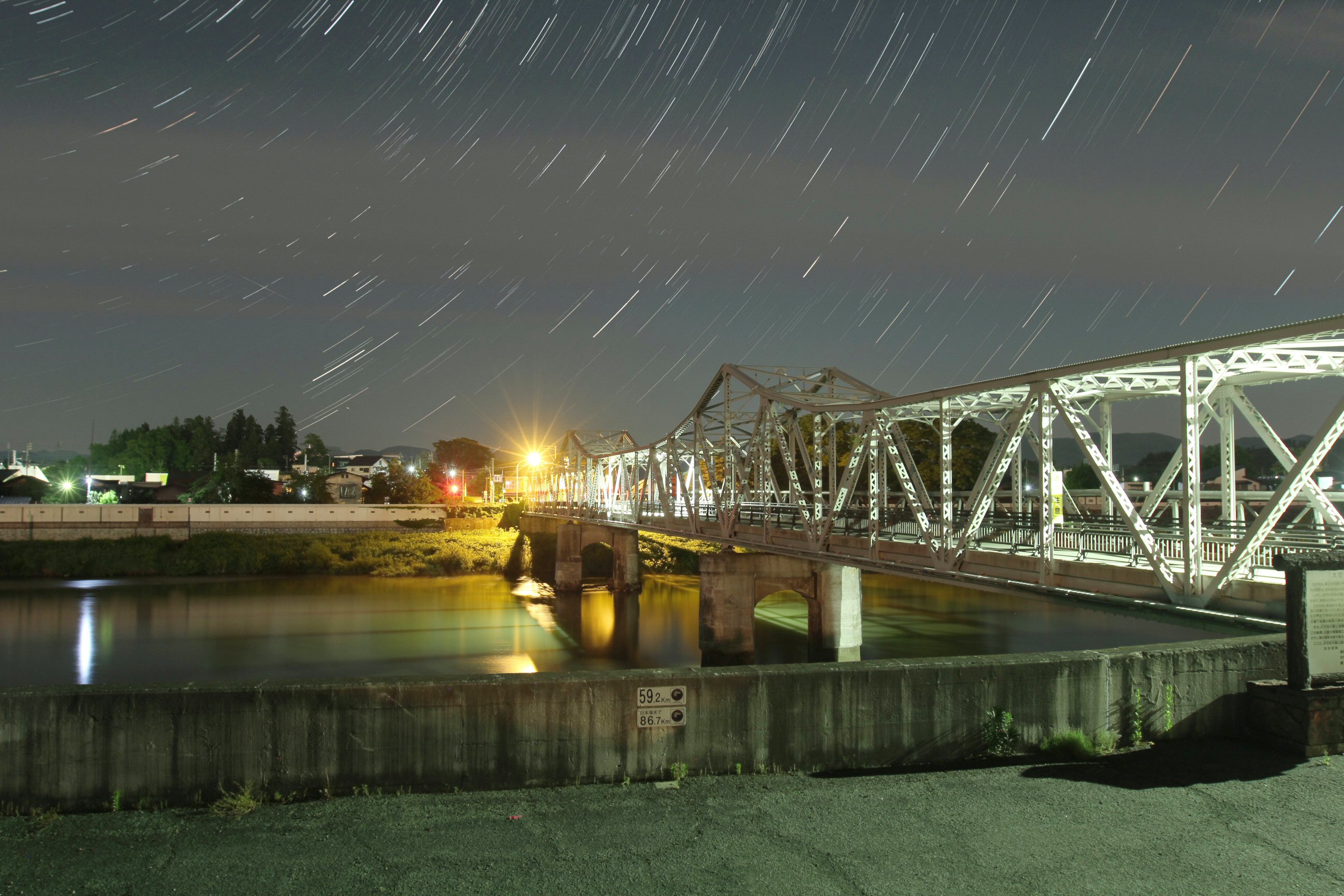 ≪星景写真≫ 最上川白壁塀蔵と大橋 (山形県大石田町)