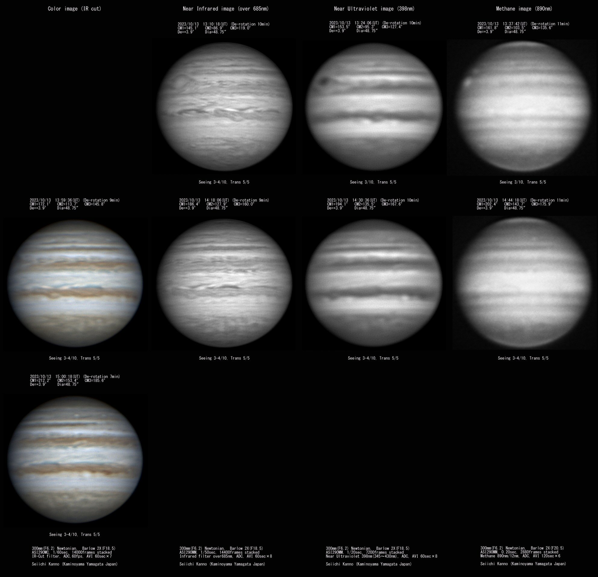 ・1セット目の「近赤外線画像」の左端側に「GRS(大赤斑)」が確認出来るが、その上方のSTBに存在する「永続白斑BA」は、暗い縁取りがなくなってしまったので判り難い状態になっている。但し、1セット目の「メタンバンド画像」ではその存在が明るい白斑として確認出来る。また,この画像のSSTB領域にAWO(高気圧性白斑)が2個確認出来、BAに上に見えるのが「A4」で後方に確認できるのが「A5」である。3セット目のカラ−画像では「A7」と「A8」も確認出来る。