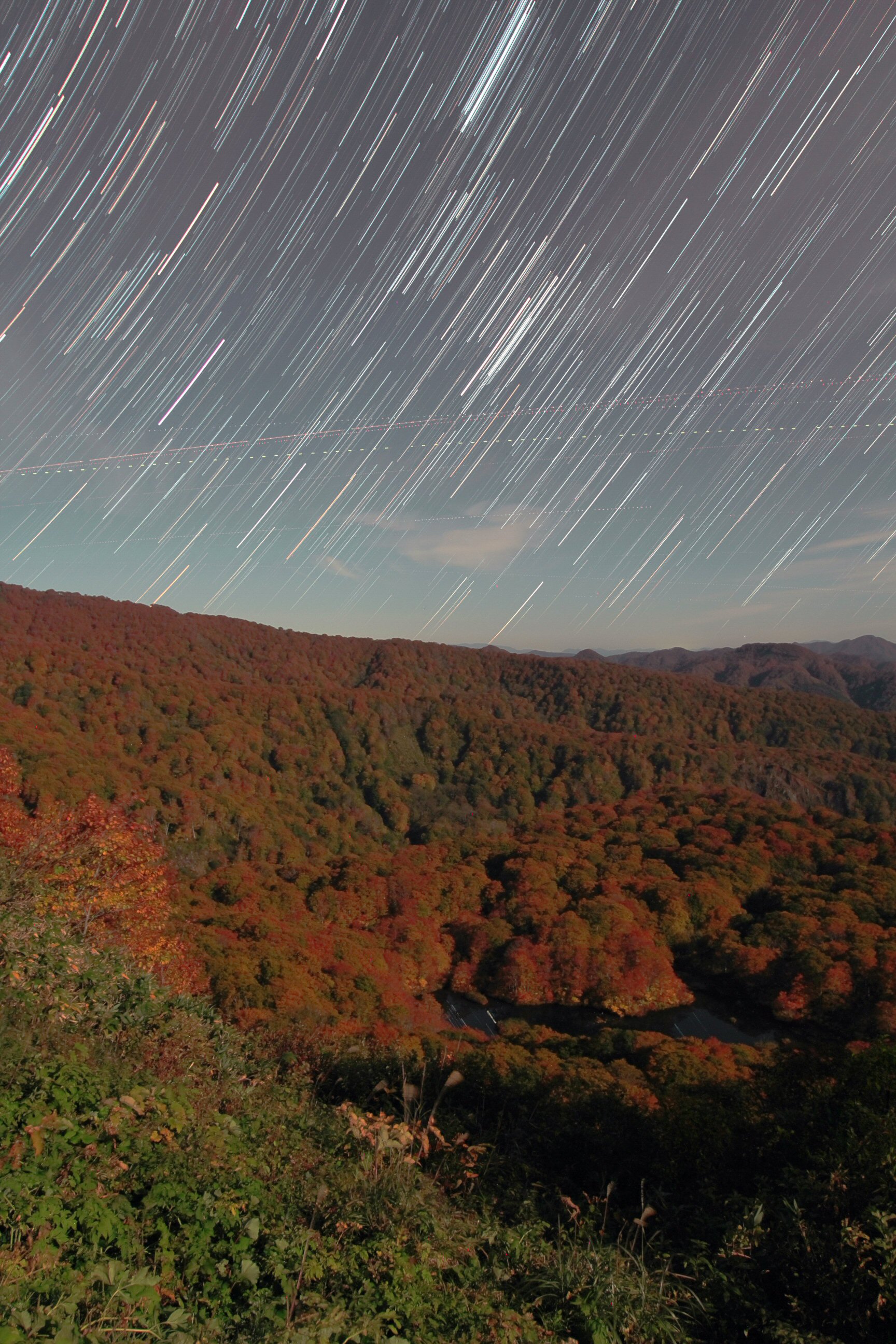 画像下部には撮影者側の斜面に月明かりの影があり、影の上側に弧を描くように 「鶴間池」 が見えており、星の軌跡も写っています。