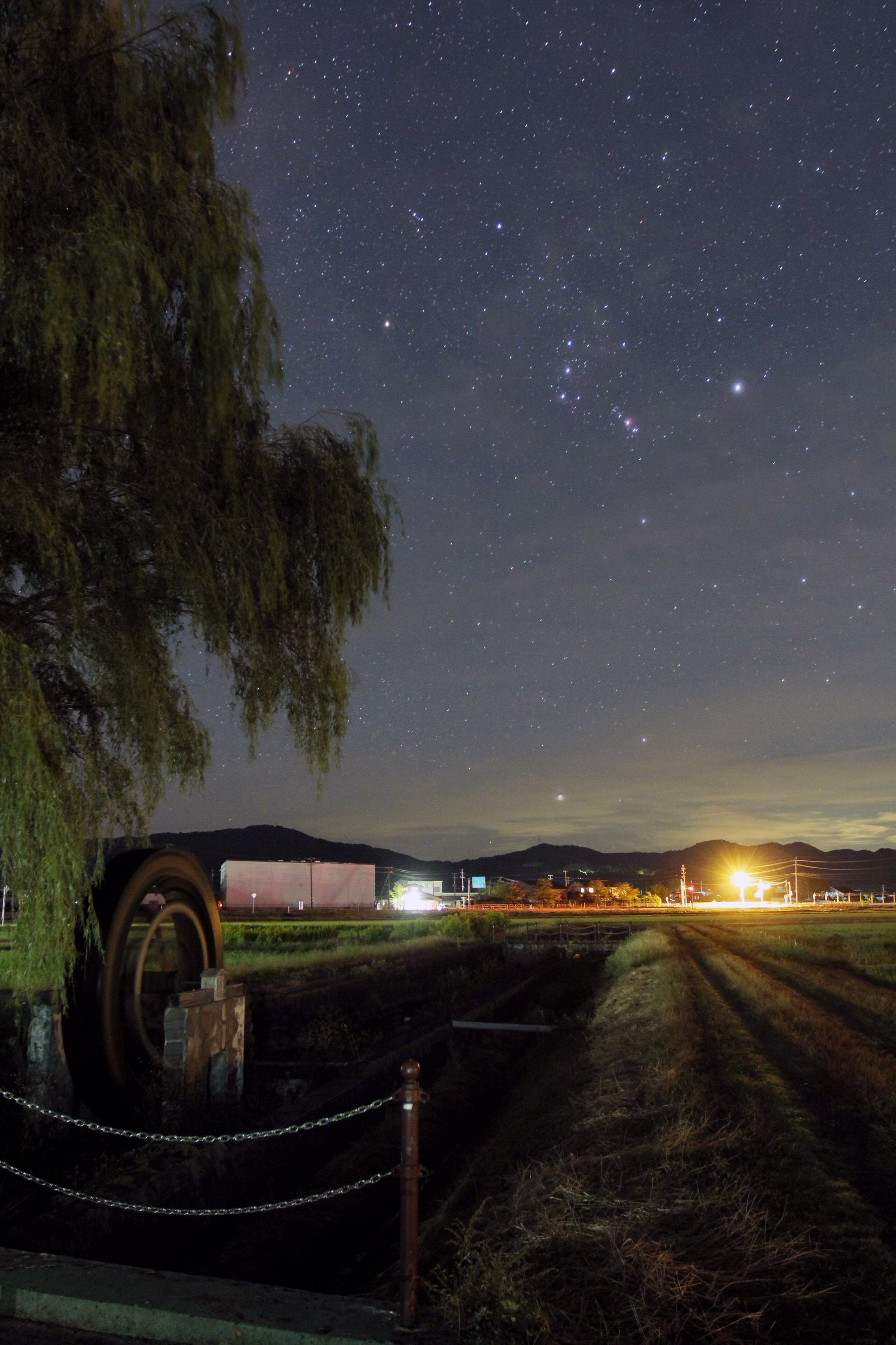 HOME←≪星景写真≫ 八ッ面川水車とオリオン (山形県遊佐町)
