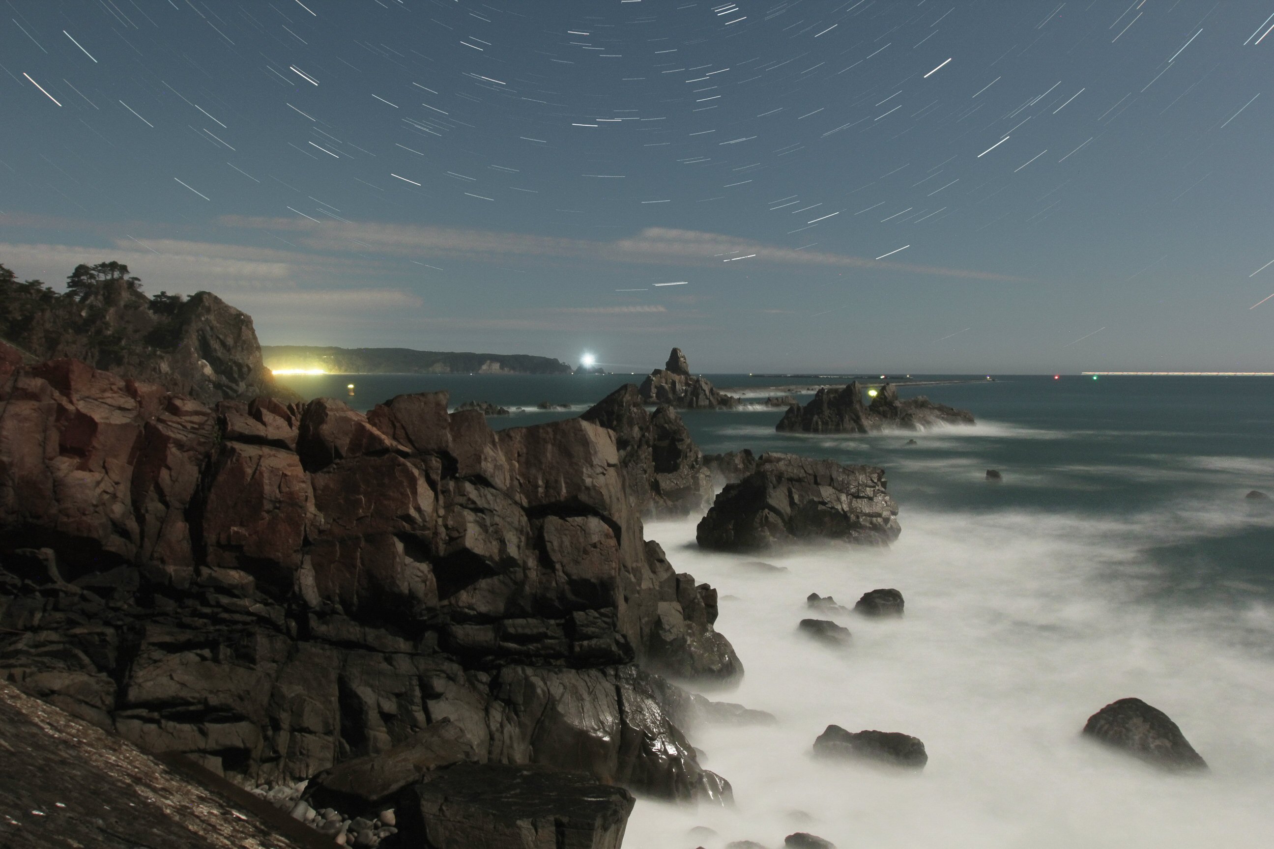 岬の先端の灯台光は 「久慈牛島大作根照射灯」 で、岩礁を照射しております。