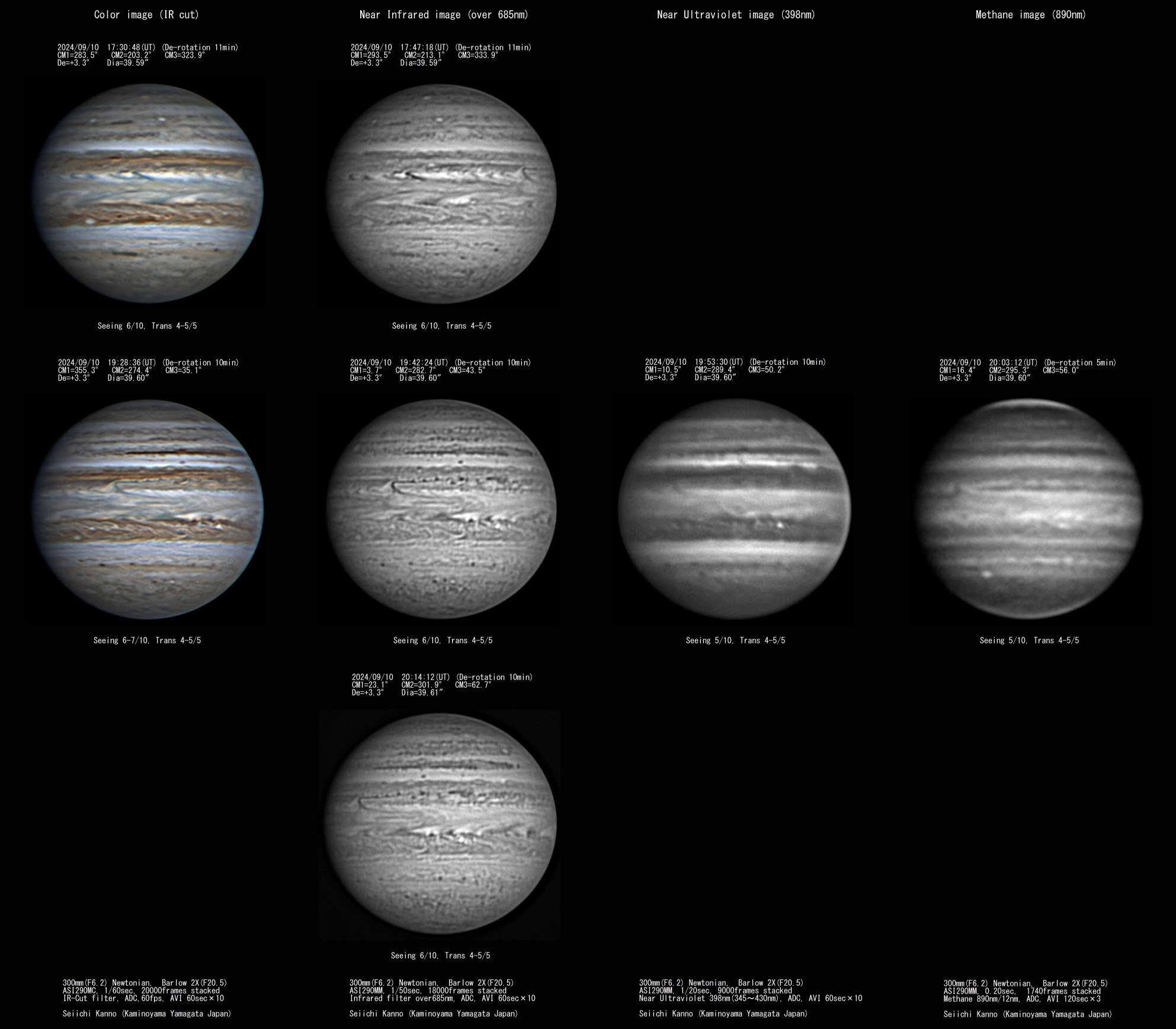 ・今回の1ショット目のカラ−画像、近赤外線画像の全域にSED(南赤道攪乱)が確認出来、その活動領域は拡大している。2ショット目の各画像では、SED(南赤道攪乱)の後端領域が確認出来、青黒い気流が右手方向に流れている様子判る。(この領域のSEBの北組織の気流は、上側の南組織とは逆方向の向かって左側に向かって動いている気流なのでこのような様子になる)