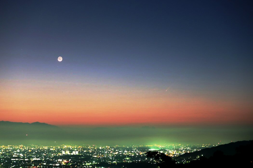 福岡市の夜景と紫金山・アトラス彗星