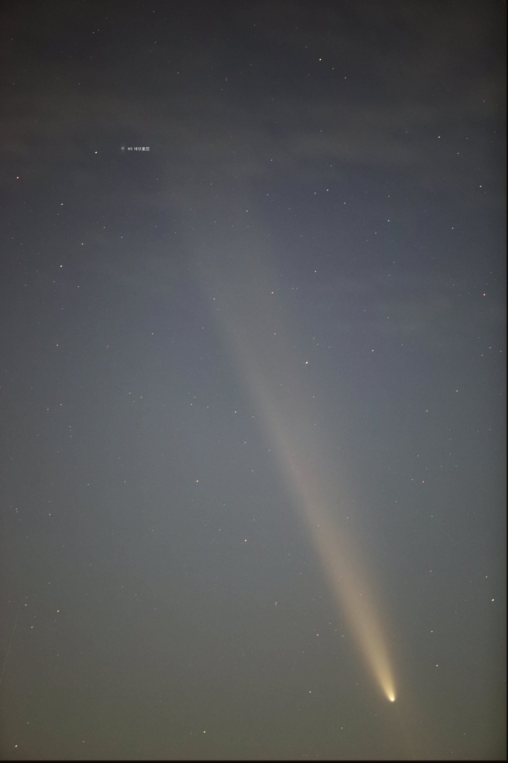 尾が伸びている先に M5 球状星団があります。アンチテイルも見えています。