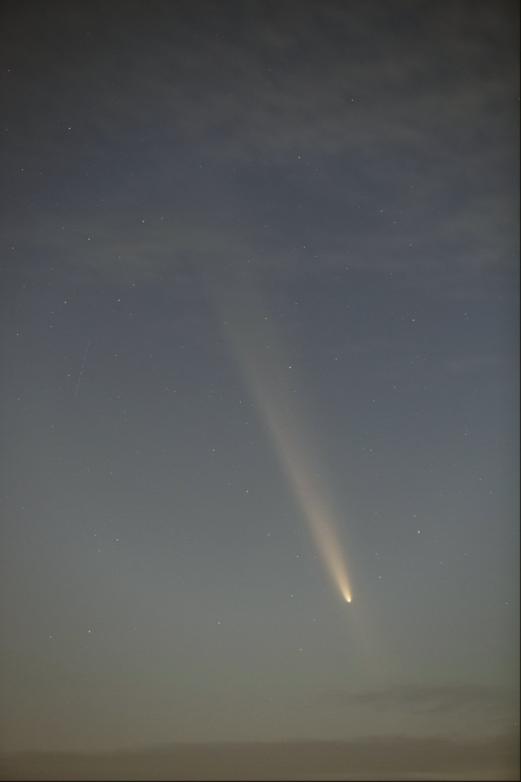 地球が紫金山・アトラス彗星の軌道面を横切り、太く淡いアンチテイルと、一角の角のような細長いアンチテイルが見えています。