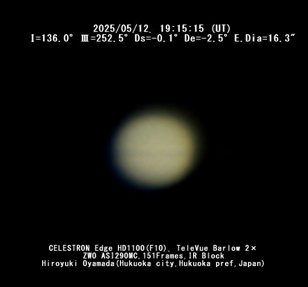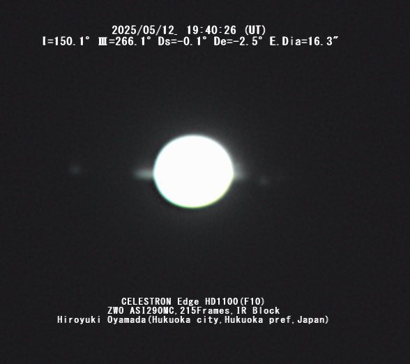 ※ 5月7日に環の平面が太陽を通過し (Ds=0.0゜) 、環の平面に太陽光が当たらなくなり見かけ上 「環の消失」 になってから5日後の撮影です。 (2025/05/14)