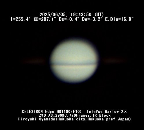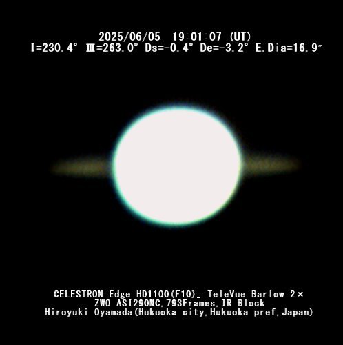 2025/06/05 UT の土星画像 ![]() ![]() 2025/06/05 UT の土星画像 撮影/小山田博之 氏 (福岡市) ※ 上段の画像はロールオーバーで強調処理画像。 (2025/06/09) |