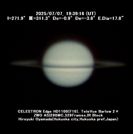 2025/07/07 UT の土星画像 ![]() 2025/07/07 UT の土星画像 雲越しのさつうぃで、トーイングは悪くなかったのですが、なんか寝ぼけた感じになってしまいました。 撮影/小山田博之 氏 (福岡市) ※ 画像はポインターのロールオーバーで淡い部分を強調 (トーンカーブ調整) した画像になります。 (2025/07/09) |
