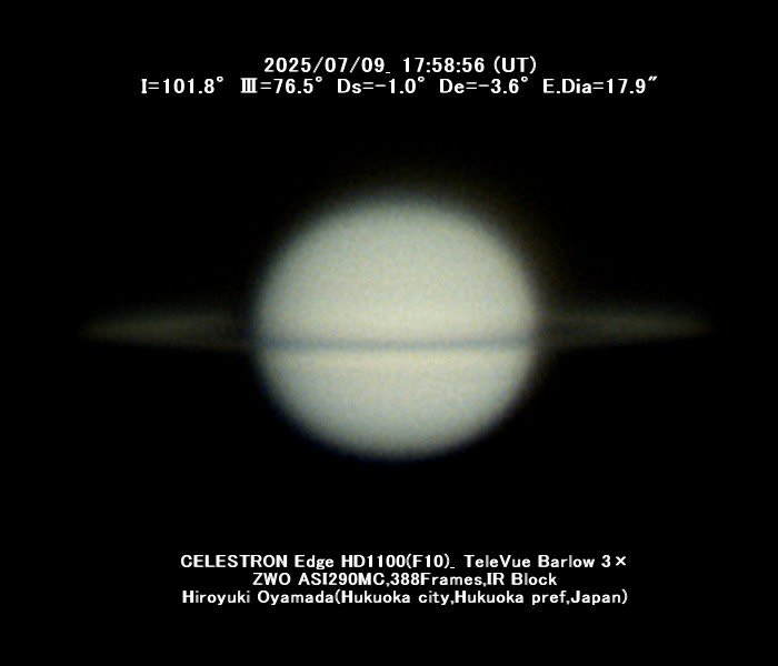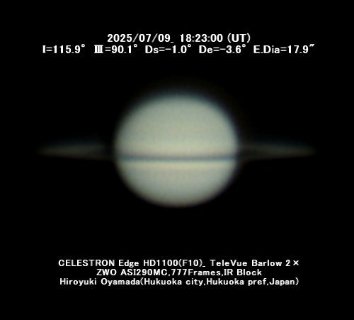 2025/07/09 UT の土星画像 ![]() ![]() 2025/07/09 UT の土星画像 土星面に特段の変化はありませんでした。 撮影/小山田博之 氏 (福岡市) ※ (2025/07/09) |