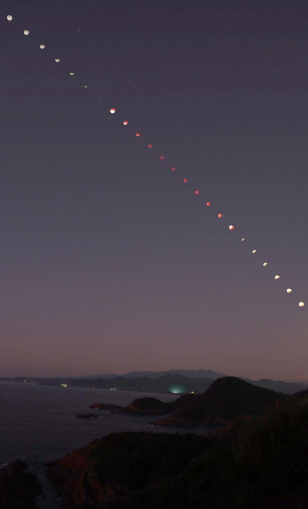 2025年9月8日 01時10分〜05時10分 (10分ごと)、 露出 : 皆既前1/3200秒・皆既中1秒・皆既後1/400秒・風景1/2秒を比較明合成、