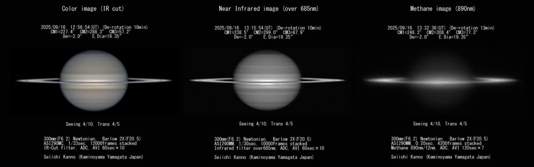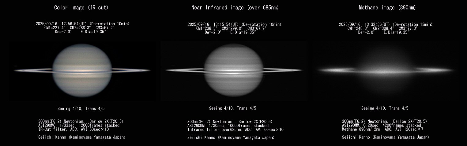現在は土星本体がリングにほとんど隠れる事がないので木星と同様に複数の縞模様の様子が確認出来ました。但し、緯度毎の縞模様の色相が異なるのは確認出来ますが、 木星の様な縞模様の複雑な変化は良くわかりません。リングが本体に落としている影が最も濃い縞模様になっています。 |