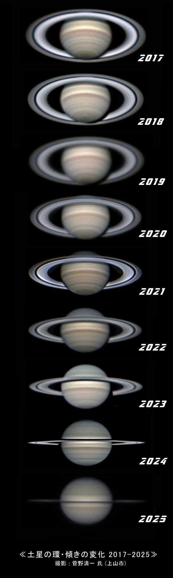 土星は昨日 「衝」 になり観望の好期です。今年 3月には環が真横を向き 「環の消失」 になりました。2017 年から 2025 年までの菅野清一氏の画像から並べて変化の移り変わりを見ていただきます。
