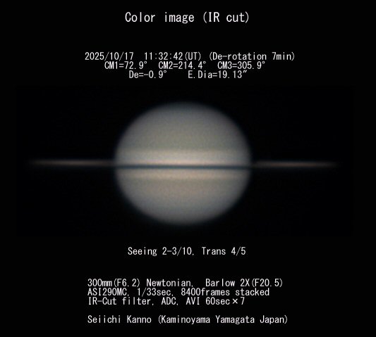 2025/10/17 UT の土星画像 ![]() 2025/10/17 UT の土星画像 撮影/菅野清一 氏 (上山市)