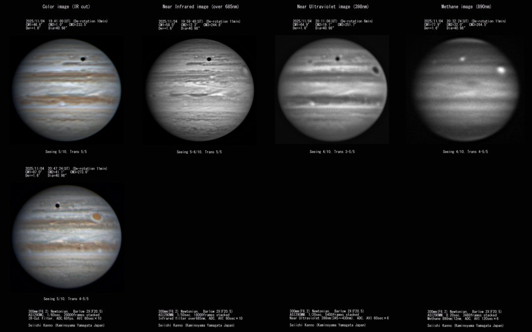 ・いずれ画像のSSTB領域の下辺付近の上空を衛星カリストが経過中で、メタンバンド画像ではその本体を明るい輝点として捉えている。メタンバンド画像では、木星大気の上層にあるもの程明るく捉える事が出来るのでGRSやSTB領域の永続白斑BAも明るく見える。 今回の画像でのBAは向かって左側の外周付近に位置しているのでそれほど明るく見えていない。衛星は木星大気の外側なので非常に明るく捉えられる。