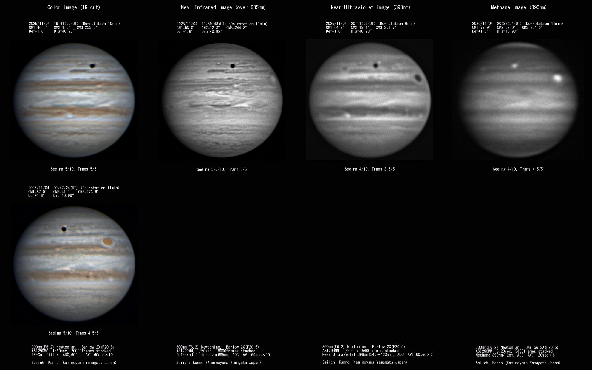 久しぶりの木星は視直径が40秒を超えて大きく感じました。 実際のシーイングはこの時期としては良好な部類でしたが、近紫外線画像とメタンバンド画像撮像の時間帯に薄雲や濃い雲の発生とシーイングの劣化に悩まされ、近紫外線画像は少ないショット数でのDerotation処理になってしまいました。