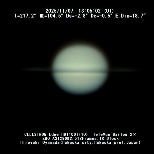 2025/11/07 UT の土星画像 ![]() 2025/11/07 UT の土星画像 撮影/小山田博之 氏 (福岡市) ※ がのロールオーバーでトーンカーブ調整画像になります。 (2025/11/09) |