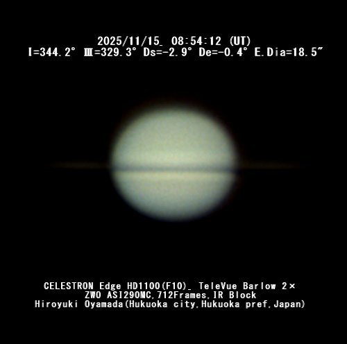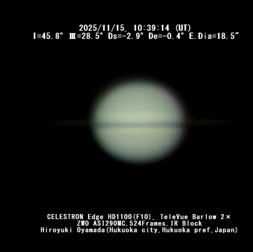 2025/11/15 UT の土星画像 ![]() ![]() 2025/11/15 UT の土星画像 撮影/小山田博之 氏 (福岡市) 環はだいぶ細くなりましたが、肉眼ではよく見えます。 ※ (2025/11/17) |