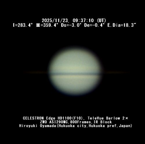 2025/11/23 UT の土星画像 ![]() 2025/11/23 UT の土星画像 撮影/小山田博之 氏 (福岡市) ※ 土星の環の準消失状態です。 (2025/11/24) |